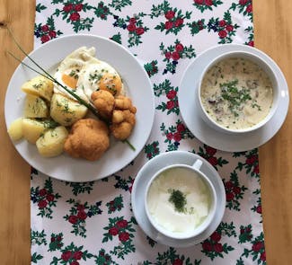 Zupa a'la leczo, dorsz panierowany, ziemniaki, surówka z kiszonej kapusty.